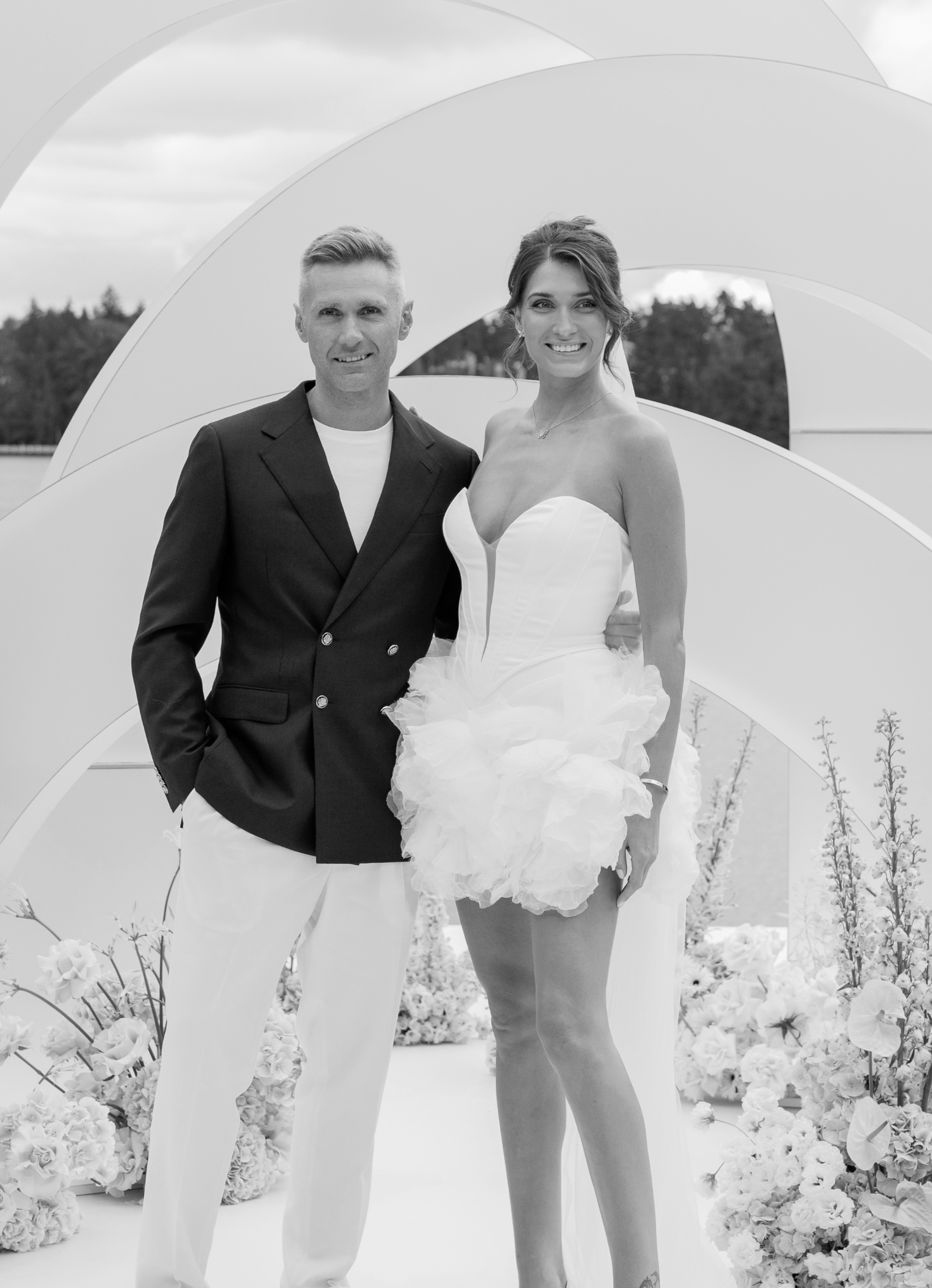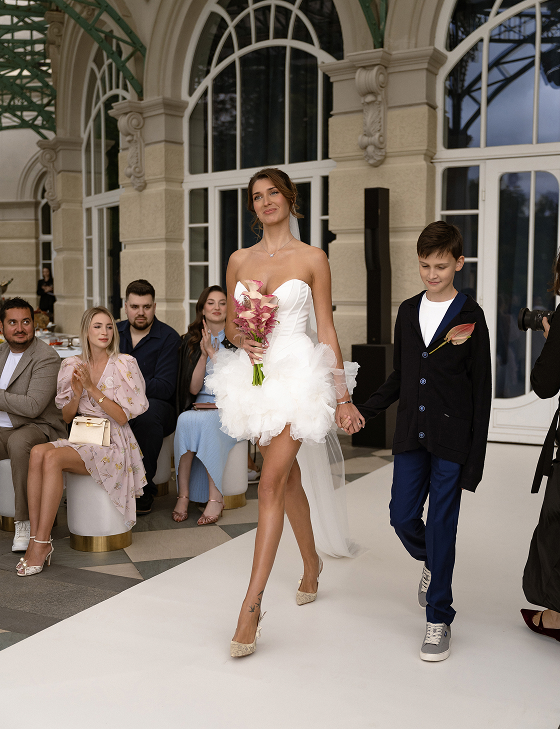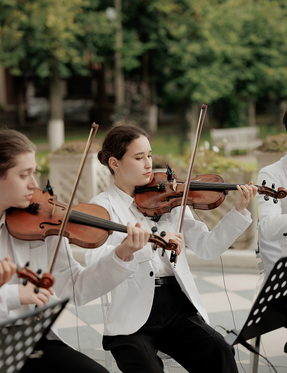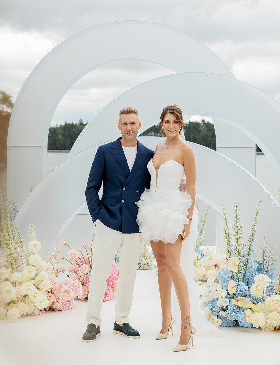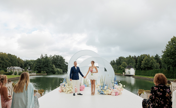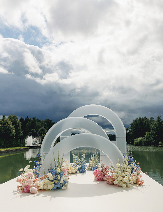 Вечер начался с welcome в классическом стиле: воздушные полупрозрачные арки, пышная флористика и живая музыка оркестра стали метафорой чистоты и трепета их любви. Церемония сопровождалась закадровым голосом, и среди пейзажей Villa Rotonda происходило главное — рождение новой семьи.