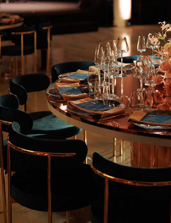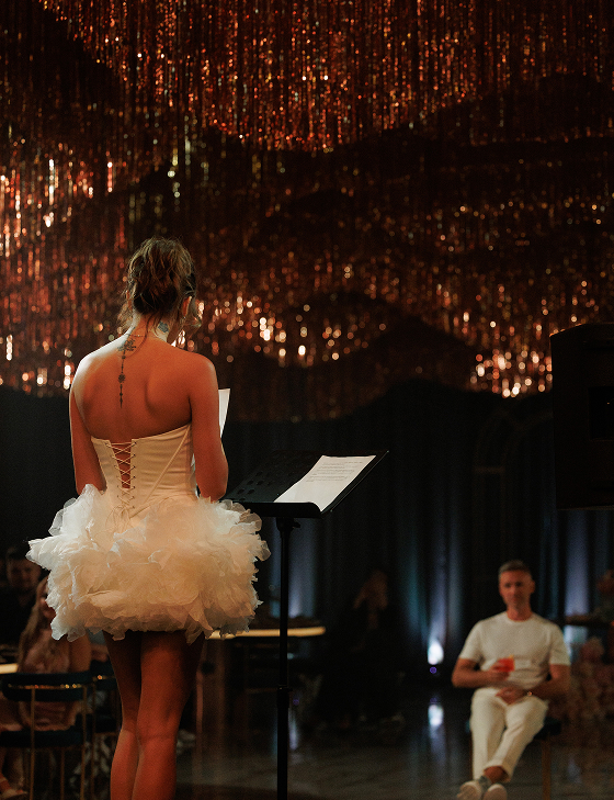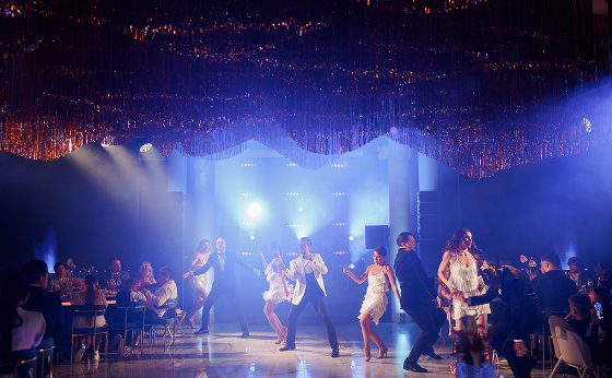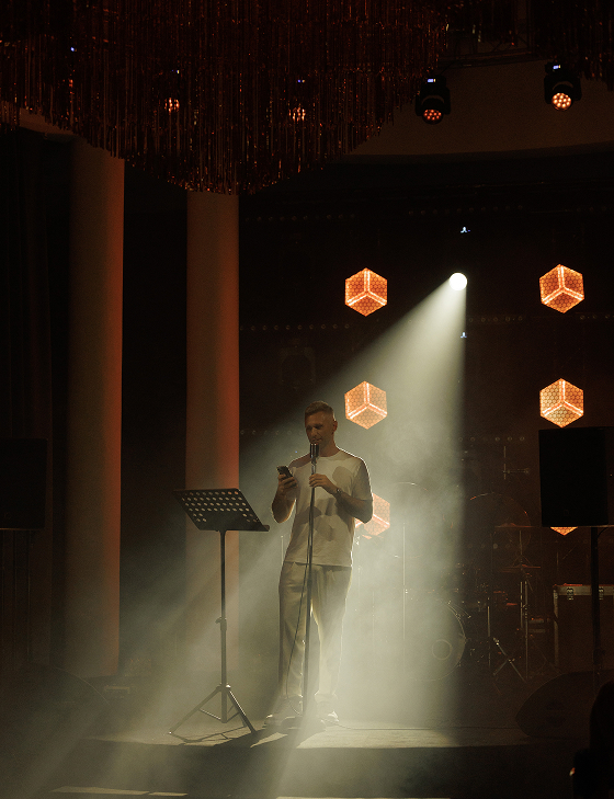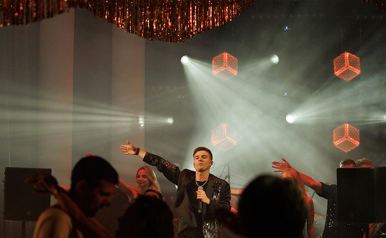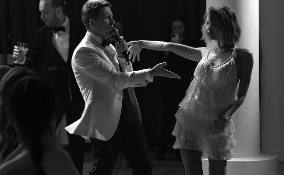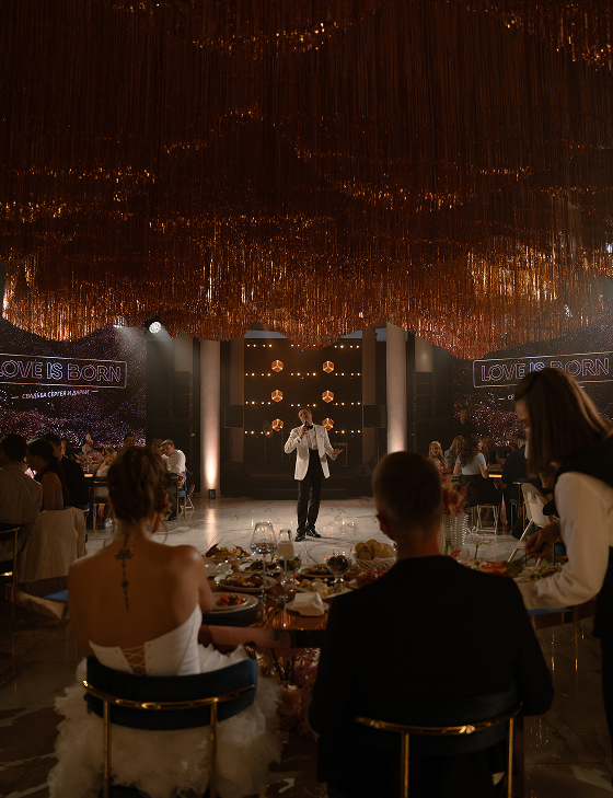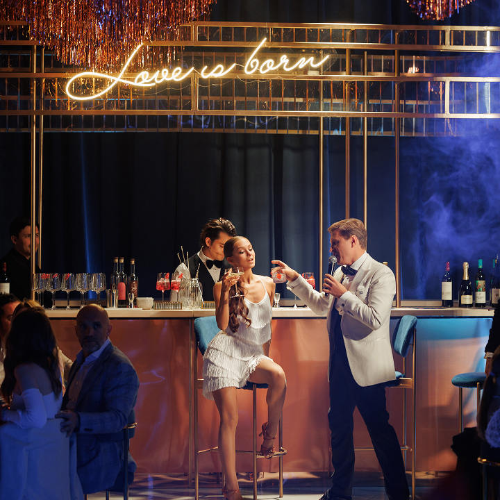Ведущий и артисты превращали вечер в увлекательное путешествие по ключевым моментам истории пары. Бармен-артист был главным рассказчиком, а история оживала в музыке, визуальных образах, интерактивах и танцевальных номерах. Авторская песня «Ритм» стала саундтреком свадебного дня, ролик Love Story в стиле Chanel и сюрпризы от близких добавляли ярких красок. Драматургия строилась так, чтобы эмоции и восторг нарастали от сцены к сцене.