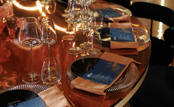 Пригласительные в формате виниловых пластинок с портретом пары, названием концепции и QR-кодом, ведущим на сайт с информацией и дресс-кодом. Эти пластинки лично доставлялись каждому гостю, становясь первым аккордом праздника ещё до его начала.